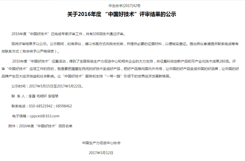 “中國好技術”是為深入貫徹落實黨中央、國務院關于實施創(chuàng)新驅(qū)動發(fā)展戰(zhàn)略和“大眾創(chuàng)業(yè)、萬眾創(chuàng)新”的精神,不斷激發(fā)全社會的創(chuàng)新創(chuàng)業(yè)活力,營造全民創(chuàng)新的良好氛圍,由中國生產(chǎn)力促進中心協(xié)會同國家相關機構(gòu)和企業(yè)共同發(fā)起和舉辦的,此獎項評選為每年一次。在2016年度“中國好技術”征集中,得到了全國各級生產(chǎn)力促進中心和相關企業(yè)的大力支持,共征集科技創(chuàng)新產(chǎn)品和可產(chǎn)業(yè)化技術成果286項,獲得“中國好技術”稱號有108個項目。評審“中國好技術”這項工作的目的,就是要把蘊藏在民間的好技術變成好產(chǎn)品,把好產(chǎn)品推向國內(nèi)外市場,讓中國的好產(chǎn)品變成中國的好品牌,讓中國的好品牌產(chǎn)生巨大經(jīng)濟效益和社會影響。讓“中國好技術”服務和支持“一帶一路”引領下的世界經(jīng)濟發(fā)展新格局,讓“中國好技術”走出國門,走向世界。