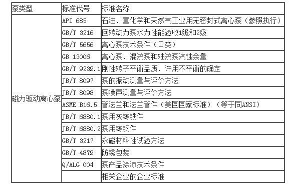 六、泵的設計、制造、檢驗應符合有關標準、規(guī)范的規(guī)定,常用磁力驅動離心泵的類型、標準代號及標準名稱見表1。