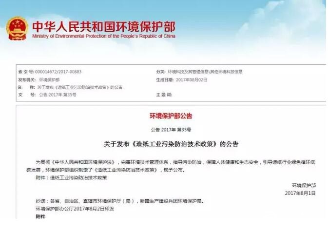 環(huán)保部發(fā)布:關于造紙工業(yè)污染防治技術政策