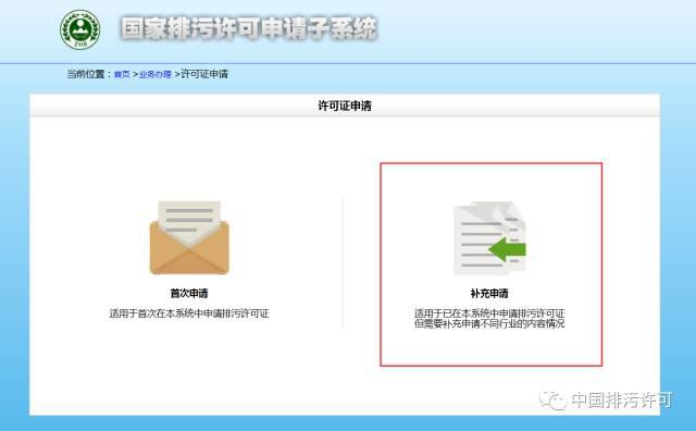 正確的操作是——進(jìn)入“國家排污許可證信息公開系統(tǒng)”的“申請子系統(tǒng)”(http://permit.mep.gov.cn/permitExt/outside/LicenseRedirect),進(jìn)行“補(bǔ)充申請”。