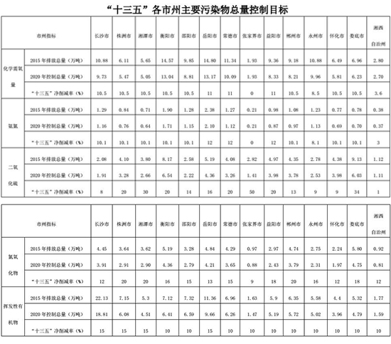 (二)主要目標(biāo)。到2020年,全省萬元生產(chǎn)總值能耗比2015年下降16%,能源消費(fèi)總量控制在17849萬噸標(biāo)準(zhǔn)煤以內(nèi)。全省化學(xué)需氧量、氨氮、二氧化硫、氮氧化物、揮發(fā)性有機(jī)物排放總量分別控制在108.57萬噸、13.58萬噸、47.05萬噸、42.24萬噸、88.45萬噸以內(nèi),比2015年分別減少10.1%、10.1%、21%、15%、10%以上。常德市、益陽市、岳陽市總磷排放量均下降10%以上。