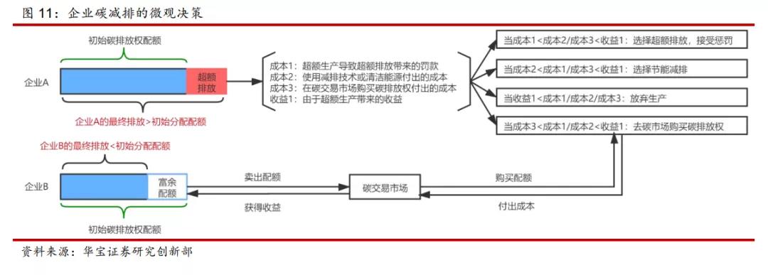 按照華寶證券的分析,有效碳市場的碳排放權(quán)的價格就是企業(yè)的邊際減排成本。在企業(yè)微觀決策上,主要是將碳減排成本、超額碳排放成本、購買碳配額的成本與超額排放生產(chǎn)帶來的收益進行比較,并作出相應(yīng)決策。