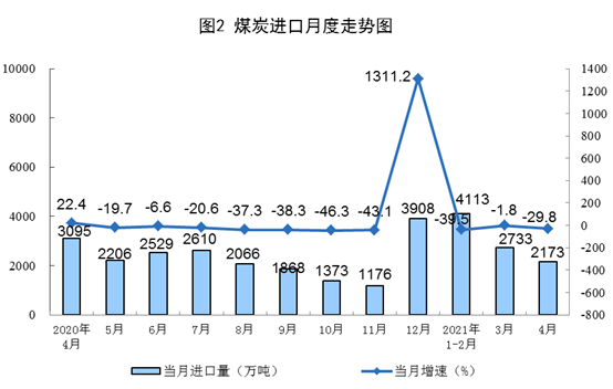 1-4月份,生產(chǎn)原煤12.9億噸,同比增長11.1%,比2019年1-4月份增長12.5%,兩年平均增長6.1%;進口煤炭9013萬噸,同比下降28.8%。