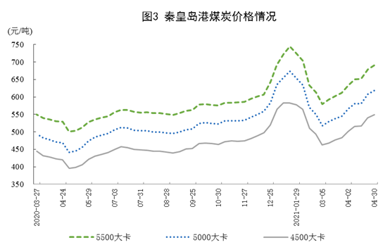 ? ? ? 港口煤炭綜合交易價格持續(xù)上漲。4月30日,秦皇島港5500、5000和4500大卡煤炭價格分別為每噸690元、618元、549元,比4月2日分別上漲56元、51元和47元。