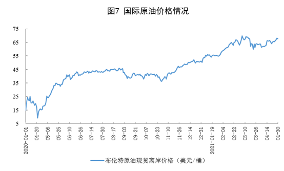 ? ? ? ?原油進口由升轉降,國際原油價格有所上漲。4月份,進口原油4036萬噸,同比下降0.2%;1-4月份,進口原油17958萬噸,同比增長7.2%。4月30日布倫特原油現(xiàn)貨離岸價格為67.73美元/桶,比3月31日的63.52美元/桶上漲6.6%。