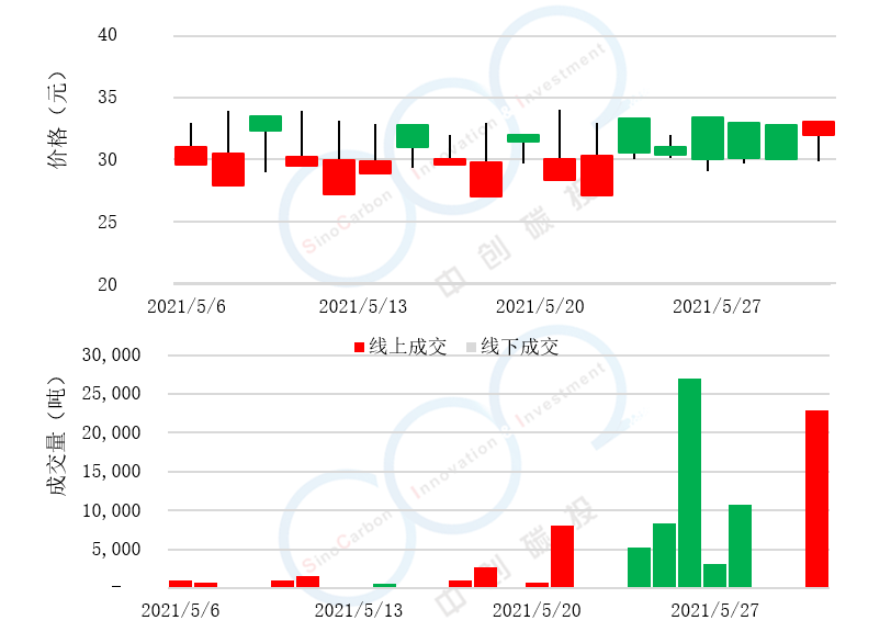 - 湖北碳價(jià)5月份較上月上漲12.3%,自26.97元上漲至30.30元。5月碳價(jià)整體波動較小,在30.00元上下浮動。