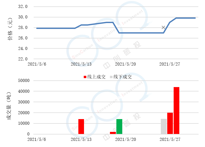- 線上成交價(jià)最低為27.00元,最高為29.80元,平均碳價(jià)為29.00元。