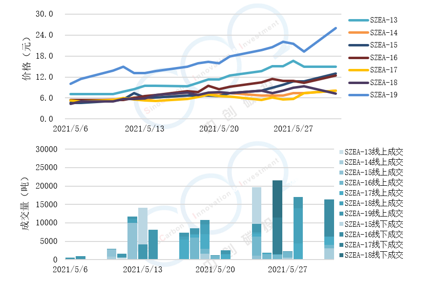 - 線上成交價(jià)最低為4.39(產(chǎn)品SZEA-18),最高為25.99元(產(chǎn)品SZEA-19),平均碳價(jià)為10.08元(平均碳價(jià)為各產(chǎn)品價(jià)格加權(quán)得出)。