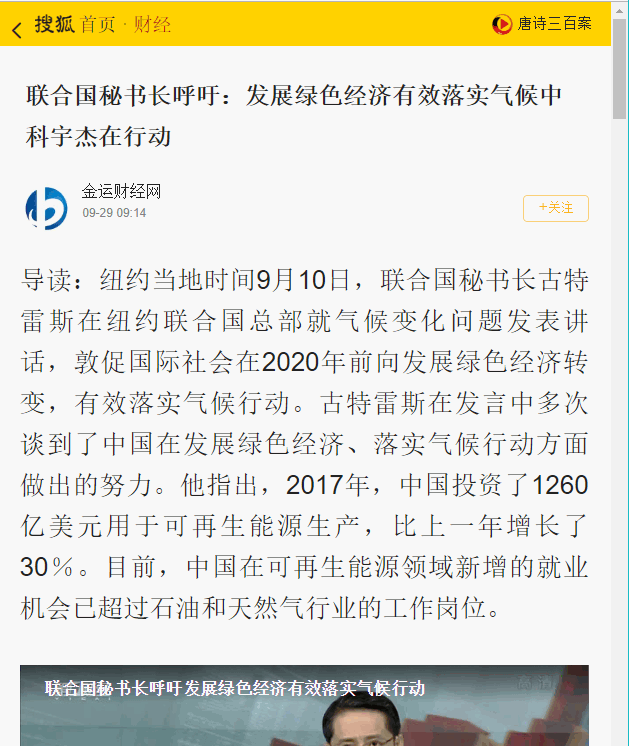 導讀:紐約當?shù)貢r間9月10日,聯(lián)合國秘書長古特雷斯在紐約聯(lián)合國總部就氣候變化問題發(fā)表講話,敦促國際社會在2020年前向發(fā)展綠色經(jīng)濟轉變,有效落實氣候行動。古特雷斯在發(fā)言中多次談到了中國在發(fā)展綠色經(jīng)濟、落實氣候行動方面做出的努力。他指出,2017年,中國投資了1260億美元用于可再生能源生產,比上一年增長了30%。目前,中國在可再生能源領域新增的就業(yè)機會已超過石油和天然氣行業(yè)的工作崗位。