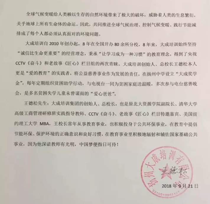 王德松先生:大成培訓集團的創(chuàng)始人、總校長,也是原北大資源學院副院長、清華大學高級工商管理研修班實踐指導教師、CCTV《奮斗》、老故事《匠心》欄目特邀嘉賓、美國紐約理工大學MBA。王校長常年從事教育事業(yè),也積極投身于公共環(huán)保事業(yè),他常常教導學生要注意節(jié)能環(huán)保、要保護我們生存環(huán)境。他在教育事業(yè)里積極地輻射和輔佐國家基礎公共事業(yè),因為他深諳教師有光明,中國夢便指日可待!
